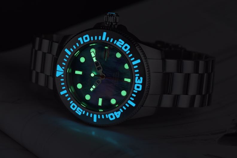 Das massive 45-mm-Edelstahlgehäuse sorgt für eine markante Präsenz am Handgelenk. Die verschraubte Krone sowie der verschraubte Gehäuseboden erhöhen die Robustheit, während das gehärtete Mineralglas das faszinierende Mother-of-Pearl (MOP) Zifferblatt schützt. Dessen natürliche Schimmerreflexe verleihen der Uhr ein exklusives Erscheinungsbild. Stundenindexe und Zeiger sind mit Super Luminous versehen und gewährleisten beste Ablesbarkeit – selbst bei Dunkelheit.
