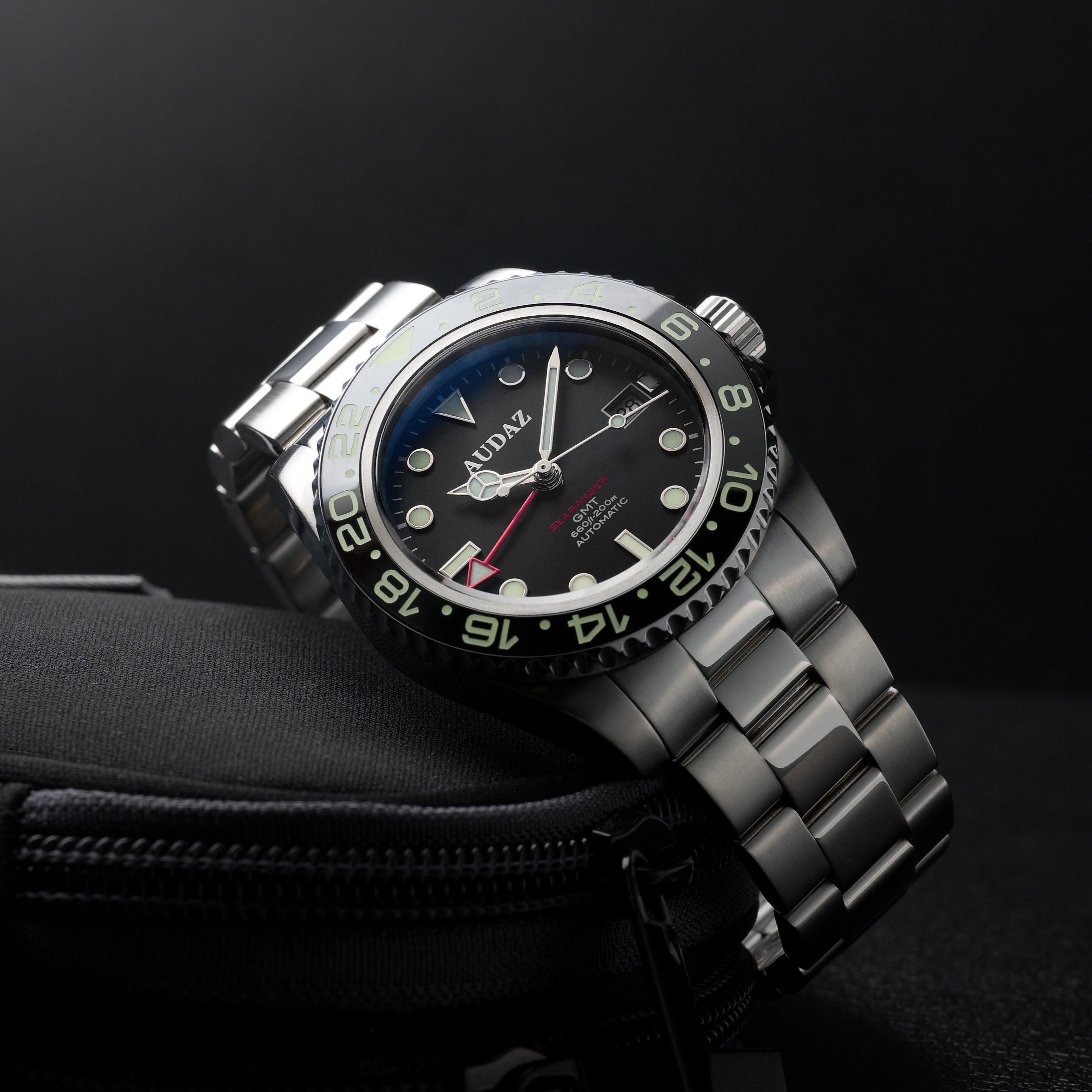 Die Audaz Sea Ranger GMT Black vereint präzises Automatikwerk, professionelle Diver-Funktionen und ein modernes Design – ideal für Abenteurer, Reisende und Liebhaber hochwertiger Taucheruhren.