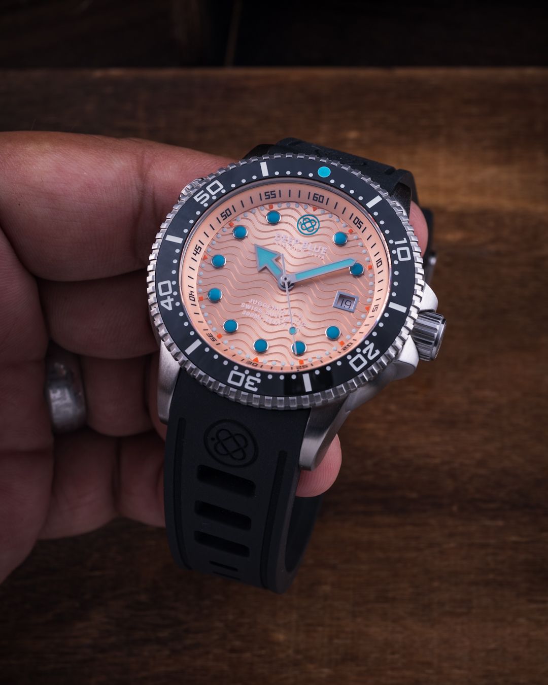 Die Deep Blue Juggernaut V Auto Salmon Orange 44mm ist die ideale Wahl für alle, die eine professionelle Taucheruhr mit auffälligem Zifferblatt, Heliumventil und hochwertigem Automatikwerk suchen.