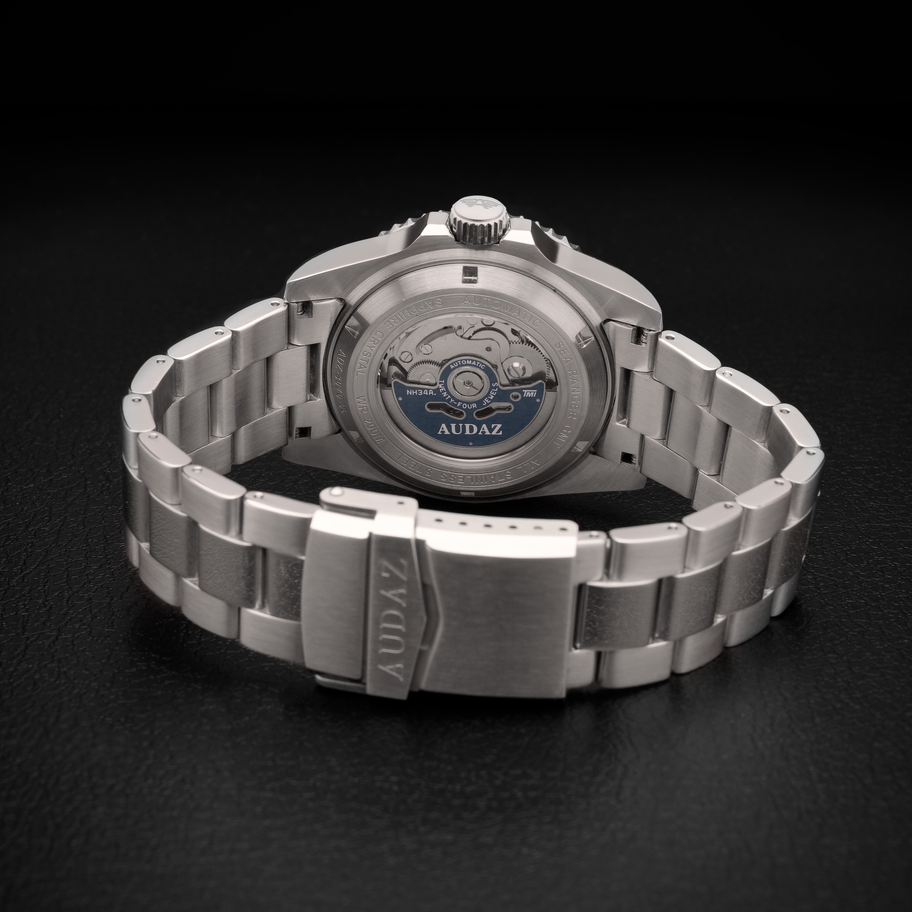 Das massive Edelstahl-Armband mit Sicherheitsfaltschließe sorgt für sicheren Halt und hohen Tragekomfort. Mit einem Gewicht von ca. 200 g vermittelt die Uhr ein hochwertiges, professionelles Tragegefühl.