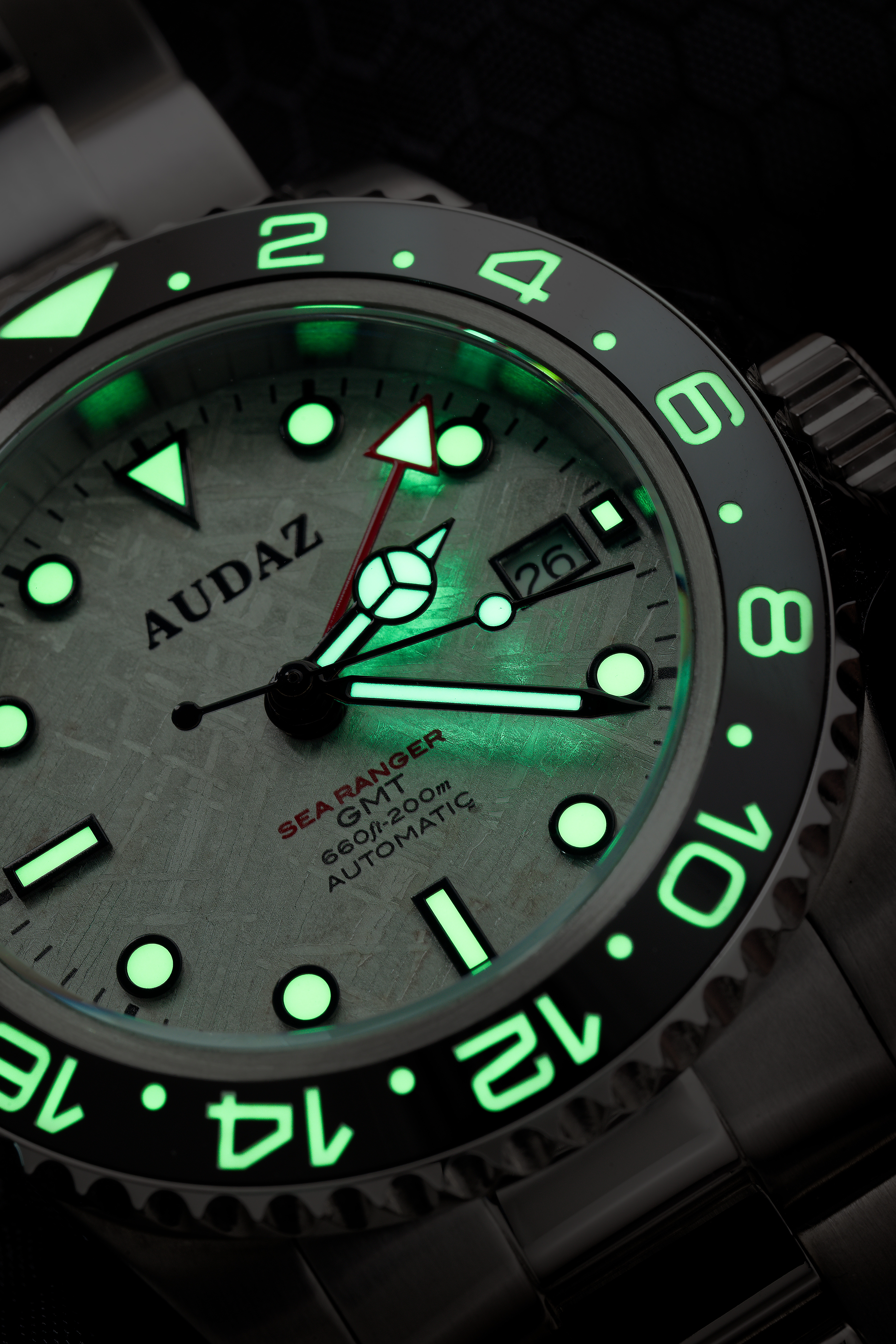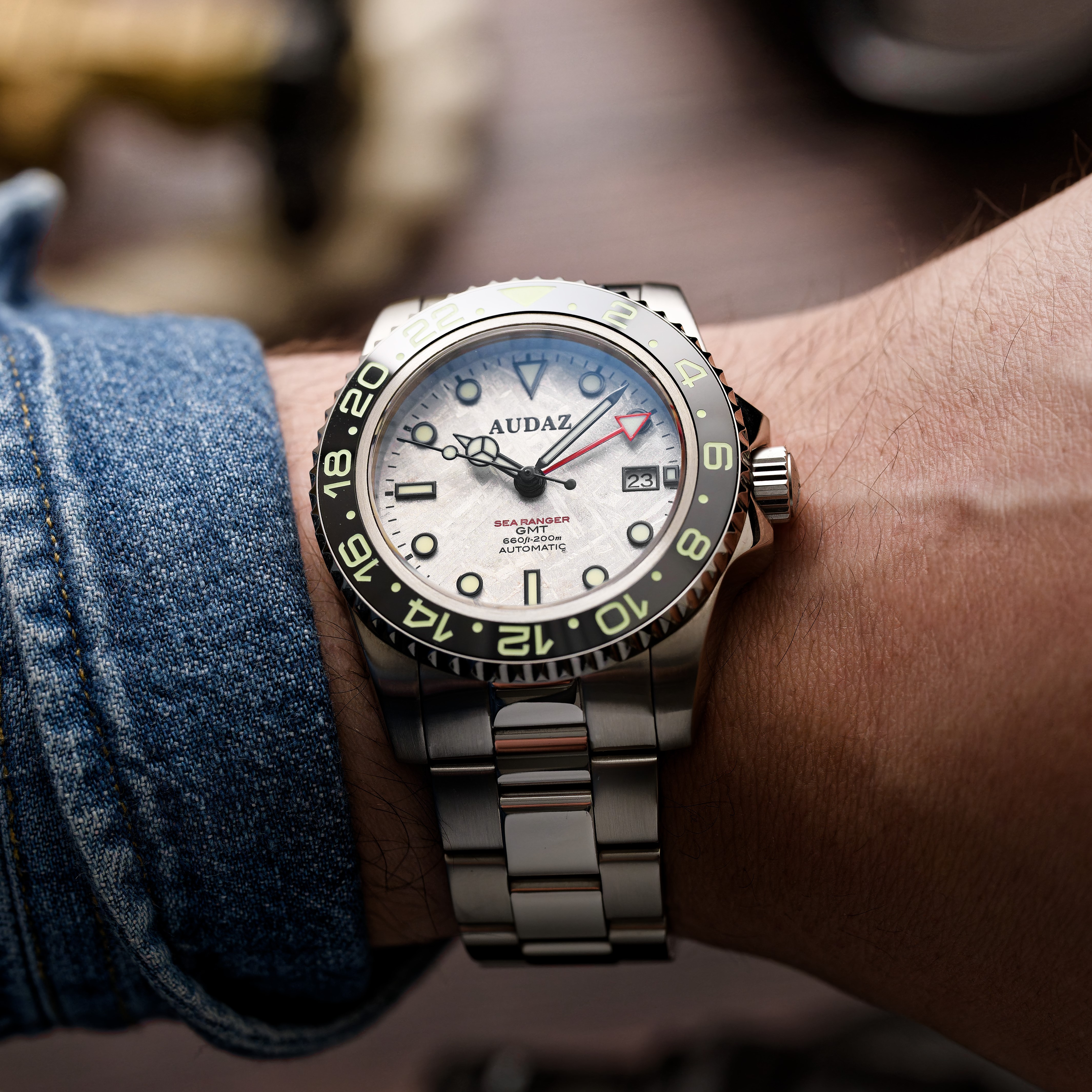 Die Audaz Sea Ranger GMT Meteorite kombiniert präzises Automatikwerk, professionelle Diver-Funktionen und ein einzigartiges Meteorite-Zifferblatt – ideal für Abenteurer, Reisende und Liebhaber außergewöhnlicher Uhren.