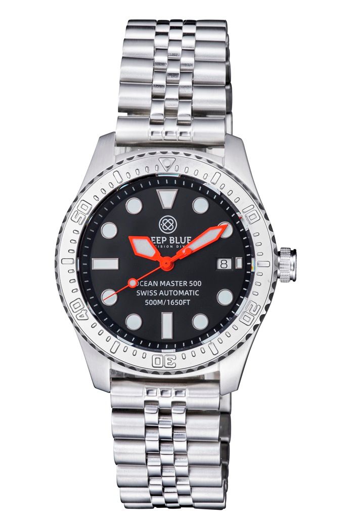 The Deep Blue Ocean Master 500 40 mm Swiss Automatic is a professional dive watch designed for precision, durability, and functionality. It features a black dial with round hour markers and orange hands, ensuring excellent legibility in all lighting conditions.