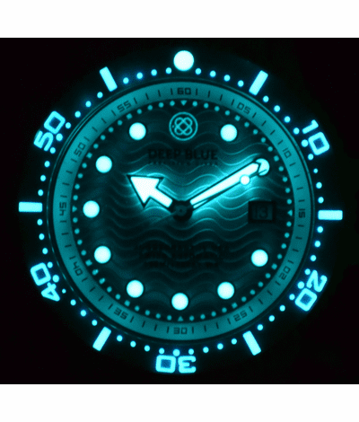 The bezel, hour markers, and hands are coated with luminous material, ensuring excellent readability in low-light and underwater conditions.