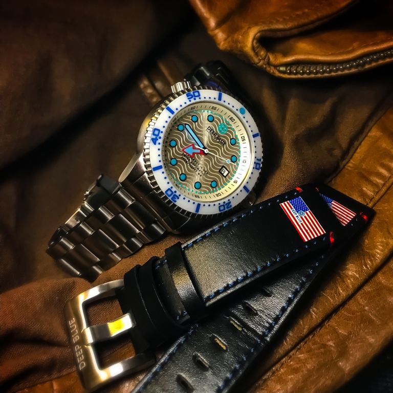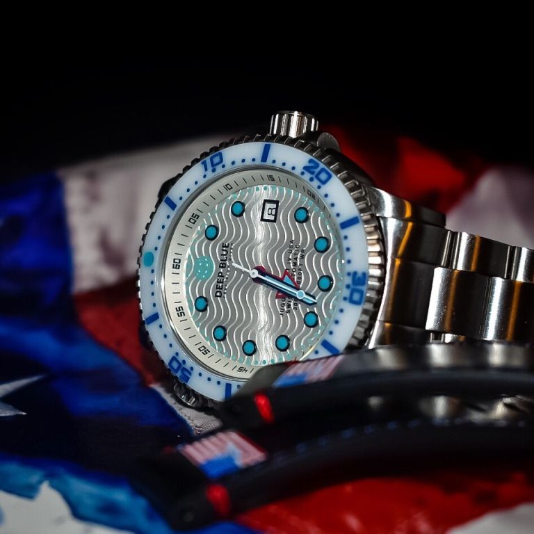 The Deep Blue Juggernaut IV Steel USA White-Blue-White #10 is a powerful 300m professional diver designed for serious underwater performance and distinctive style.