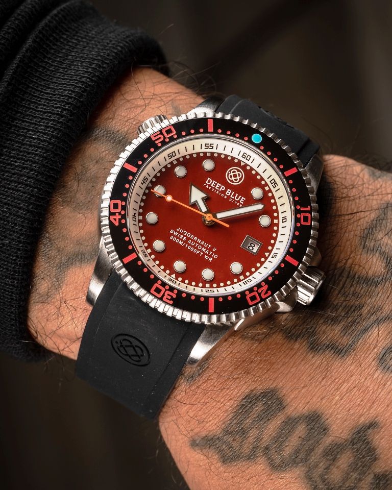 The Deep Blue Juggernaut V Red Jasper 40mm is a high-quality dive watch that combines technical precision with sporty design. Built for professional divers and watch enthusiasts, it offers reliability, functionality, and a bold wrist presence.