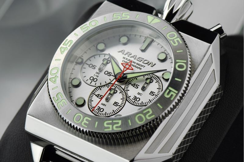 Jede Uhr, die den Namen "Concept" trägt, ist etwas ganz besonderes und somit auch absolut eigenständig, in seiner Form. Mit einem Durchmesser von 48 mm ist sie zwar nicht besonders groß, doch durch die eckige Form und die Abschrägung an beiden Seiten wirkt sie um einiges größer als sie ist. Für dünne Ärmchen ist sie definitiv nicht geeignet; außer man steht darauf und es ist einem egal. . Sämtliche Zeiger der Totalisatoren stehen perfekt in ihren Positionen wenn sie auf Bereich "Null" sind. Das Quarzwerk von Seiko arbeitet präzise ohne Aussetzer. Die Krone ist massiv und griffig und man hat keine Probleme sie nach dem Loslösen der Verschraubung raus zu ziehen um die Zeit einzustellen. Das polierte Gehäuse ist ebenso perfekt gearbeitet, wie die einseitig drehbare Lünette. Sie rastet exakt ein und die beiden Doppel-Dreiecke stehen exakt über der 12. Das Superluminova ist viel, viel kräftiger als bei anderen Aragon Uhren und sie erwecken den Anschein, als würden kleine Lämpchen in den Zeigern, Indexen und den Zahlen der Lünette verbaut sein. Auch die Dauer der Leuchtzeit hält sehr lange an und verblasst auch nach Stunden in der Dunkelheit nie zur Gänze. Das hochglanzpolierte Gehäuse ist ebenso perfekt gearbeitet, wie die 4 matt gehaltenen Linien an den Schrägen und das Muster an den beiden Seiten des Gehäuses. Die beiden Chronogrphenknöpfe knacken hörbar beim Betätigen und reagieren umgehend beim Drücken. Das Silikonband ist sehr anschmiegsam, tut am Arm nicht weh und lässt sich ohne Beschädigungen von Verunreinigungen leicht sauber machen. . Fazit: ein tolle, sehr große Uhr, die sich angenehm tragen lässt, deren Super Luminova jedes Tritium-Röhrchen bei weitem übertrifft, dazu noch auffällt und durch den massiven 316L-Stahl unglaublich robust ist. Wer auf massive, große und schwere Uhren steht, sollte zugreifen, denn alle Serien der "Concept" Reihe sind so gut wie immer schnell vergriffen. Leider habe auch ich diese Erfahrung schon gemacht.