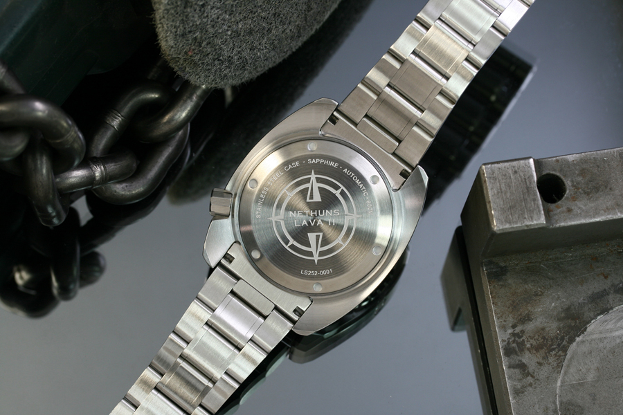 The case is crafted from solid stainless steel, ensuring structural strength and excellent corrosion resistance. With a diameter of approximately 45 mm and a height of around 16 mm, the Lava II delivers a powerful wrist presence typical of serious professional divers. The screw-down crown and screw-down case back provide maximum sealing integrity. Tested to 60 ATM (600 meters) water resistance, this watch is suitable for professional deep-sea use. An integrated helium escape valve allows controlled pressure release during saturation diving.