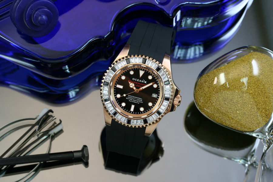 The OceanX Sharkmaster 1000 Black White Rubber Automatic Limited Edition is a striking diver’s watch designed for collectors and underwater enthusiasts. Its black dial with subtle white accents and a durable red-gold IP coated case give it a bold, contemporary look. With a unidirectional bezel set with crystals, this watch allows precise timing during dives, while the helium escape valve ensures safety during deep-sea decompression.