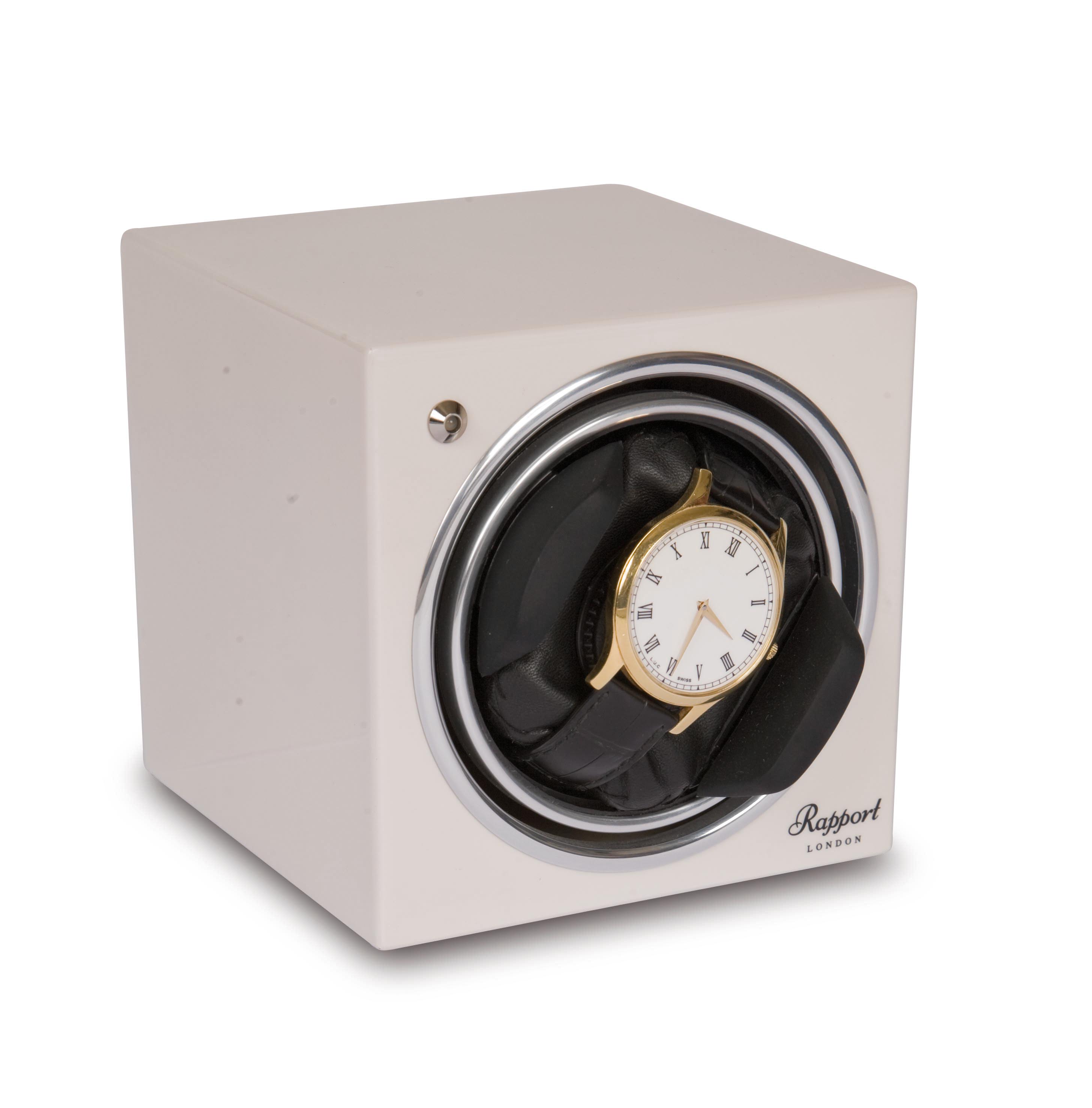 Ein Uhrenbeweger der Traditionsmarke Rapport London für eine Uhr. Optisch in einem klassichen quadratischen Design. Der Uhrenbeweger ist mit einer LED Kontrollleuchte ausgestattet. Optional ist der Betrieb mit Netz- oder Batteriebetrieb (Batterien nicht im Lieferumfang enthalten) möglich.