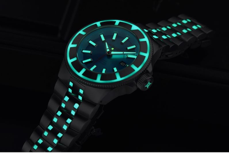 | Leuchtmasse: | Gehäuse und Armband, Stundenindexe, Superluminova, Uhrenzeiger |