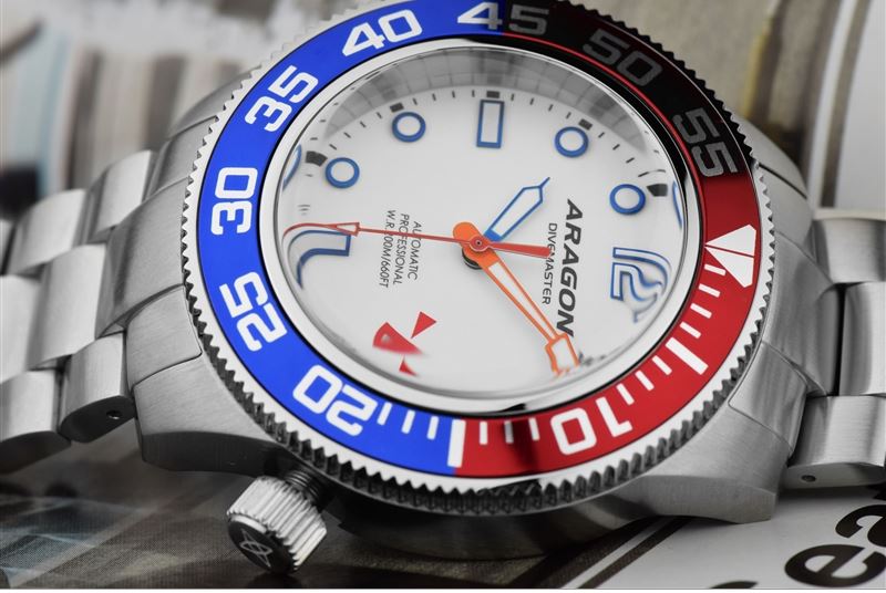 Der erste Eindruck dieser Aragon Divemaster III 50 mm ist schon mal Super.Der Orange umrandete Minutenzeiger und der Stundenzeiger in schimmernden leichtem blau,einfach Klasse.Das Edelstahlarmband passt genau ( Habe auch kräftige Handgelenke) kann aber problemlos geändert werden.Die Pepsi Lünette könnte etwas leichtgängiger sein. Die Wertigkeit des Armbandes spiegelt sich beim tragen wieder.Eben gute Qualität.Die Krone gesetzt auf 4 Uhr macht einen durchdachten Sinn.Es drückt nicht bei bestimmten Bewegungen der Hand.Das Ziffernblatt in einem satten Weißton.Das Uhrwerk Seiko Automatik NH35 ist ein mechanisches grundsolides Werk.Die Ablesbarkeit ist durch Super-Luminous in der Nacht sehr gut..Die runden Indexe sind in einer klaren Struktur gesetzt.Dies ist meine zweite Aragon und wird nicht die letzte sein