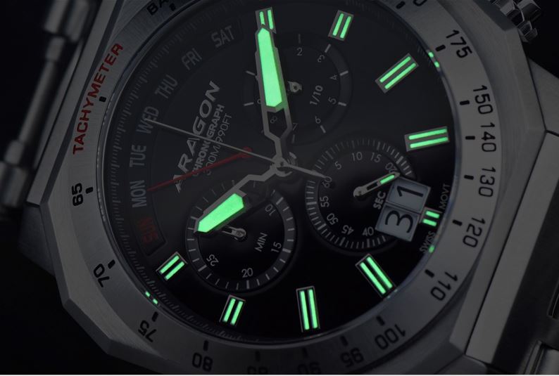 | Leuchtmasse*: | Krone, Stundenindexe, Super Luminous, Uhrenzeiger |