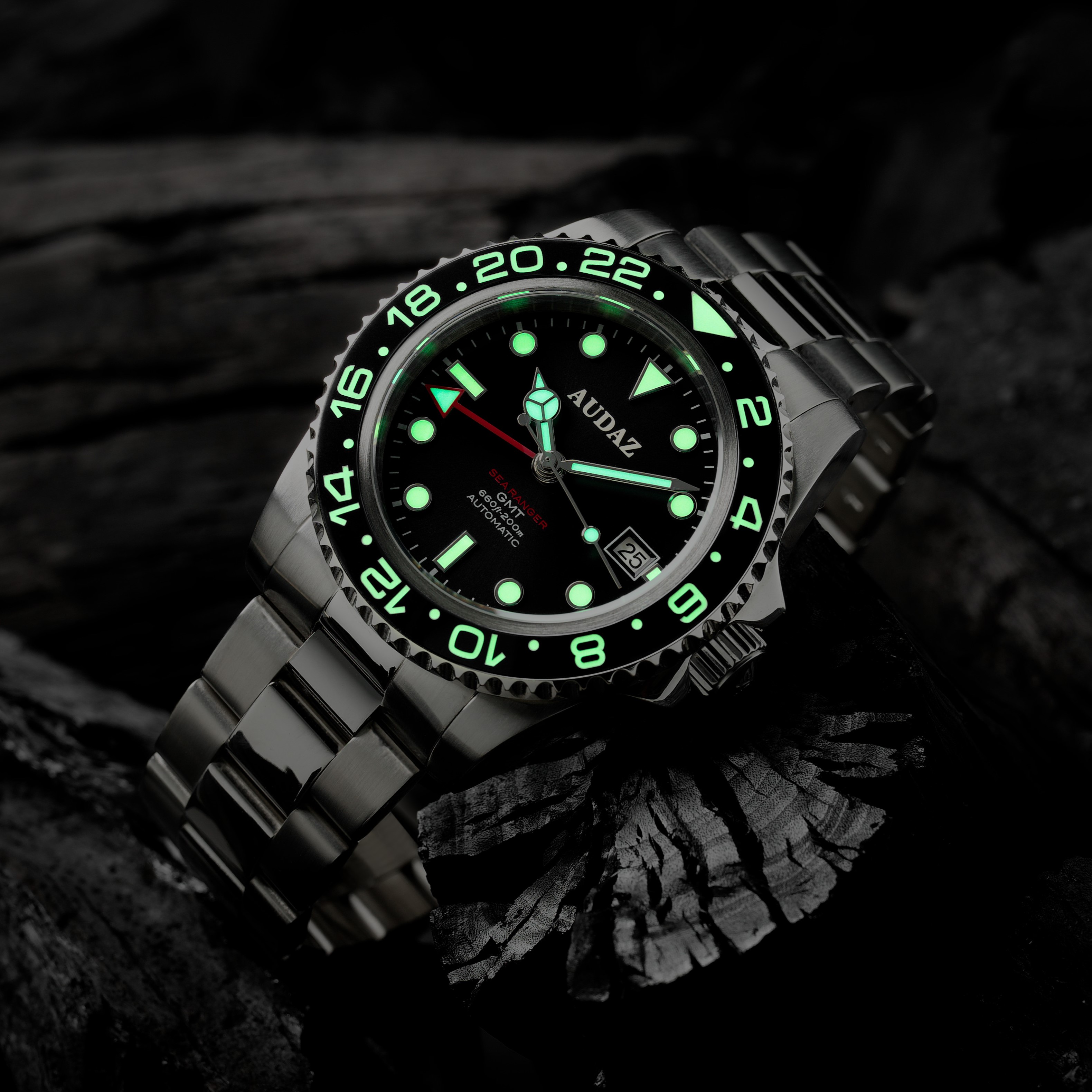 Die Audaz Sea Ranger GMT Black vereint präzises Automatikwerk, professionelle Diver-Funktionen und ein modernes Design – ideal für Abenteurer, Reisende und Liebhaber hochwertiger Taucheruhren.