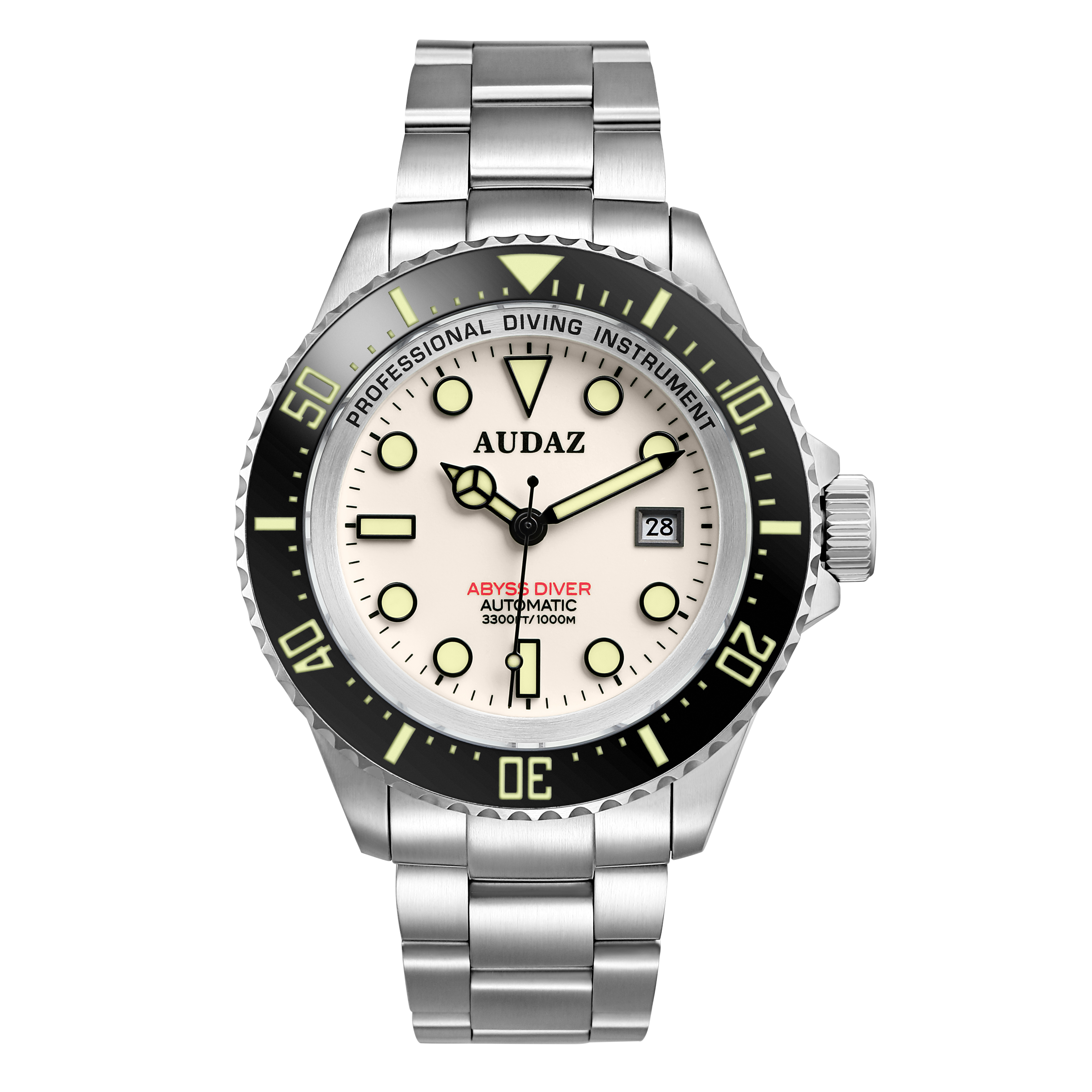 Die Audaz Abyss Diver White Lume 1000m Automatic ist eine professionelle Taucheruhr, die für extreme Tiefen und höchste Ansprüche entwickelt wurde. Mit einer beeindruckenden Wasserdichtigkeit von bis zu 100 ATM (1000 m) und einem integrierten Heliumventil ist sie perfekt für Sättigungstauchgänge und intensive Unterwasserabenteuer geeignet.