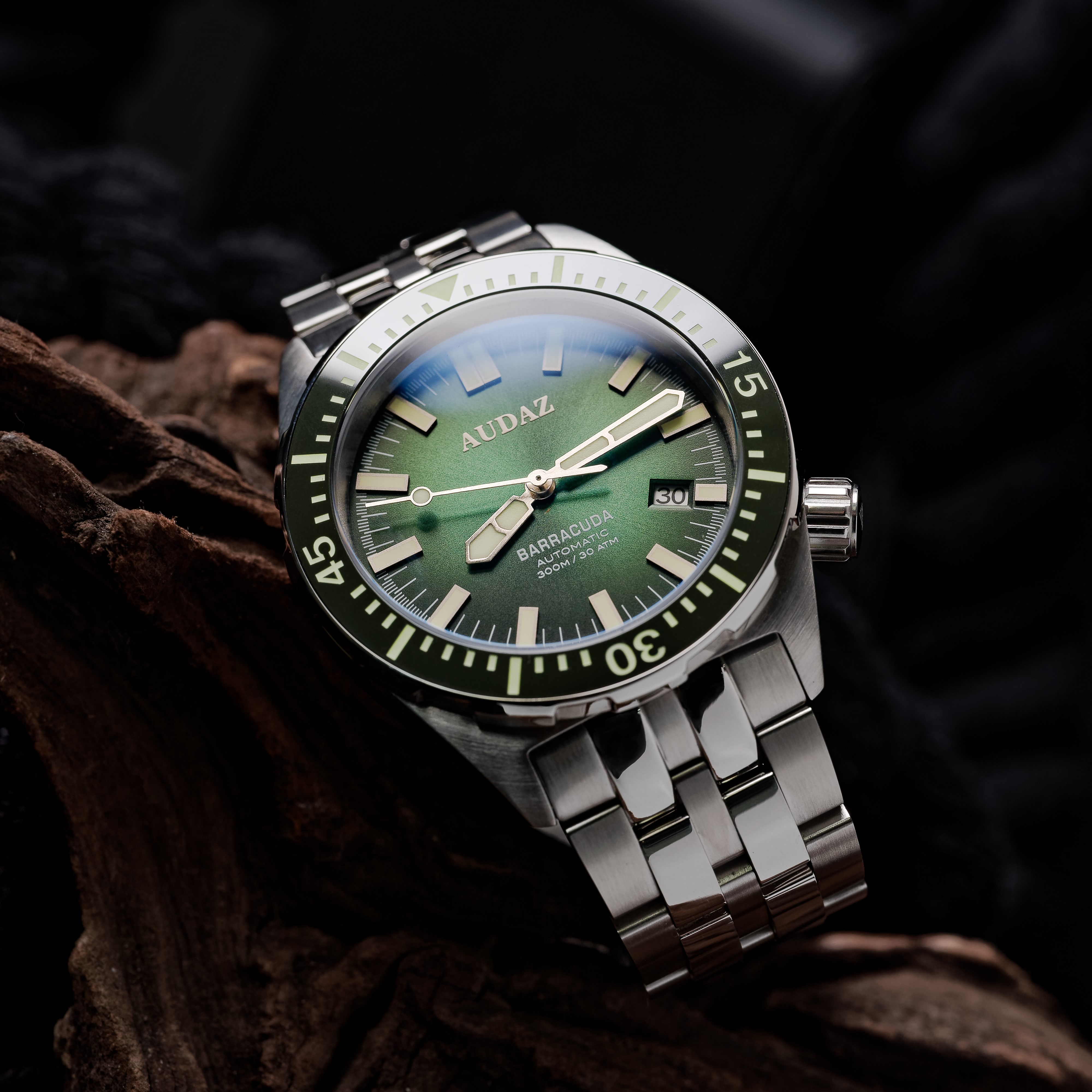Die Audaz Barracuda Green 42mm Automatic ist eine leistungsstarke Taucheruhr, die robuste Funktionalität mit modernem Diver-Design verbindet. Ihr massives Edelstahlgehäuse mit einem Durchmesser von 42 mm und einer Höhe von 15 mm sorgt für eine beeindruckende Präsenz am Handgelenk, während das kratzfeste Saphirglas das schwarze Zifferblatt zuverlässig schützt. Die mit Superluminova beschichteten Stundenindexe und Zeiger garantieren optimale Ablesbarkeit – selbst in völliger Dunkelheit.