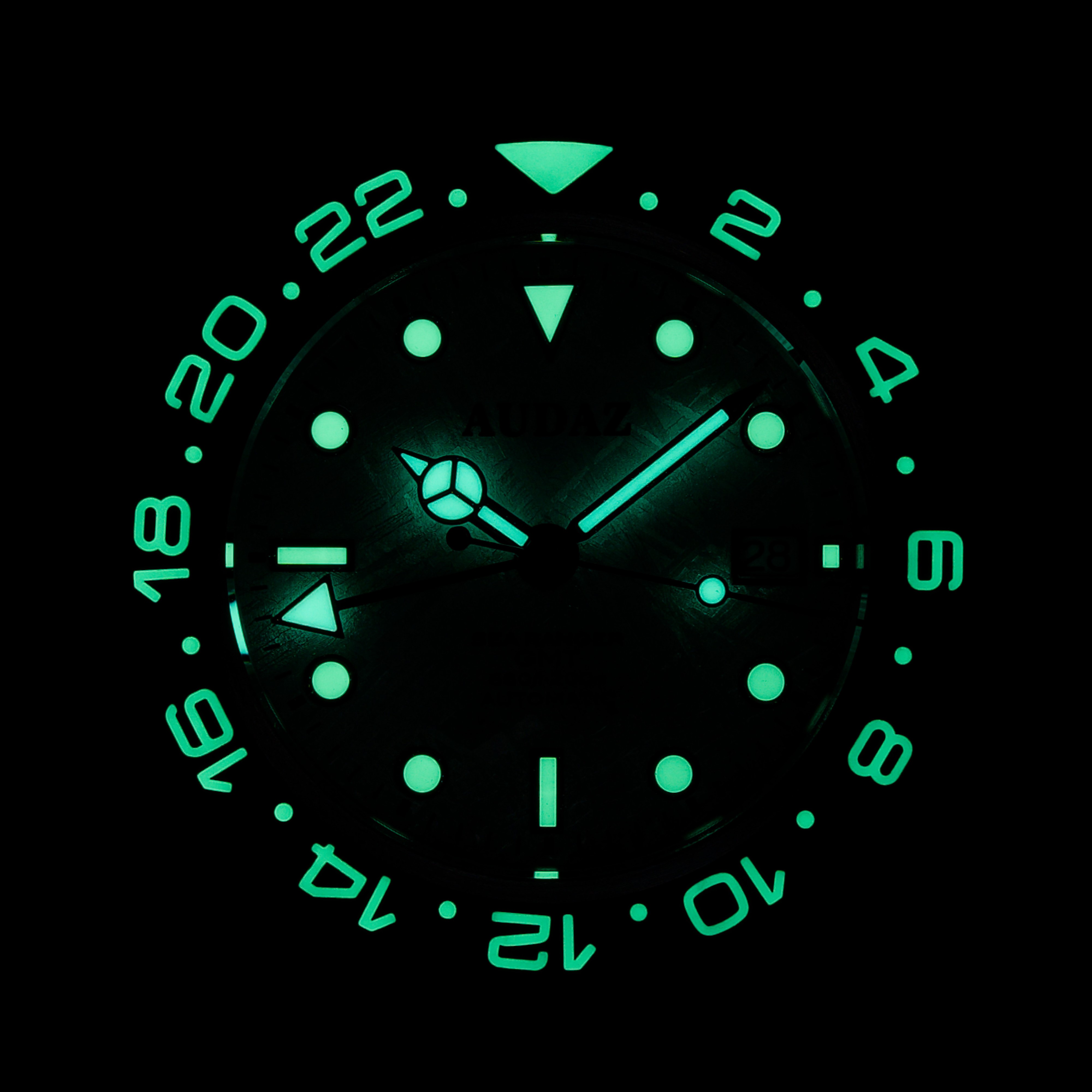 Die Audaz Sea Ranger GMT Meteorite kombiniert präzises Automatikwerk, professionelle Diver-Funktionen und ein einzigartiges Meteorite-Zifferblatt – ideal für Abenteurer, Reisende und Liebhaber außergewöhnlicher Uhren.