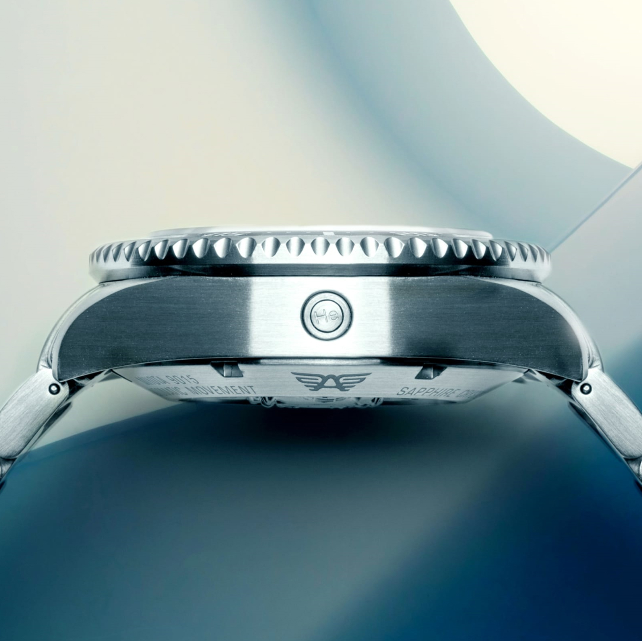 Ihr massives Edelstahlgehäuse mit einem Durchmesser von 44 mm und einer Höhe von 16 mm bietet außergewöhnliche Stabilität, während der verschraubte Gehäuseboden und die verschraubte Krone zusätzliche Sicherheit gewährleisten. Das kratzfeste Saphirglas schützt das charakteristische Aqua-Blaue Zifferblatt, das durch seine Tiefe und Leuchtkraft sofort ins Auge fällt.
