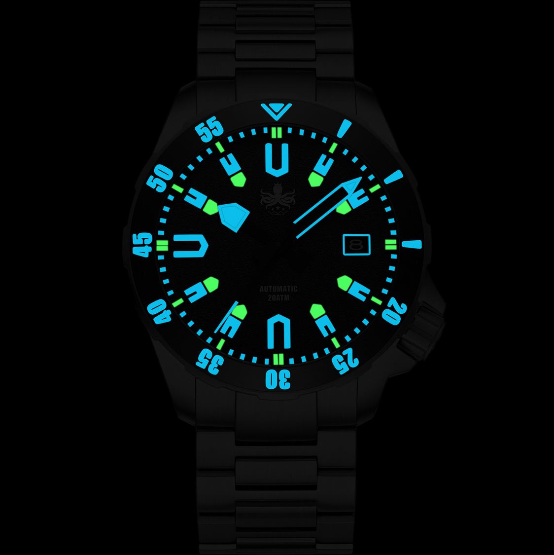 | Leuchtmasse: | Lünette, Stundenindexe, Superluminova, Uhrenzeiger |