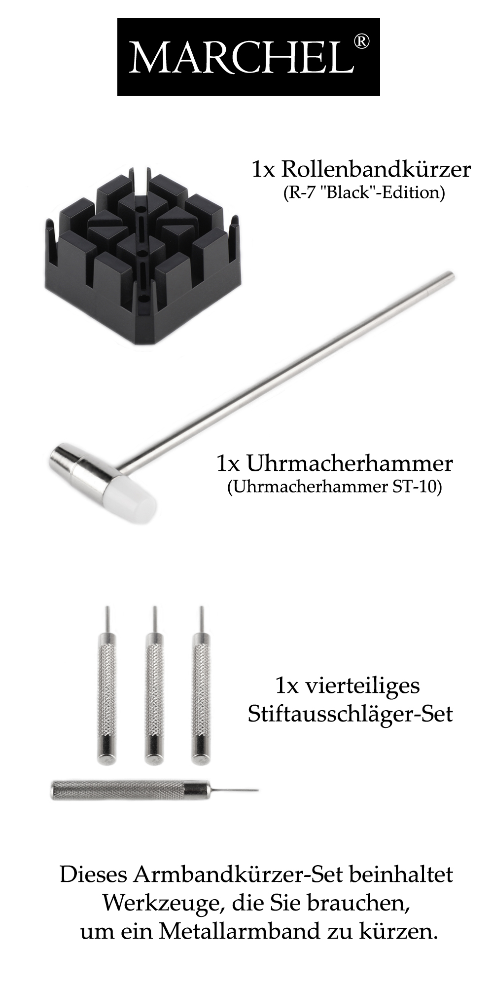 Armbandkürzer-Set: 1x Rollenbandkürzer R-7 "Black"-Edition, 1x vierteiliges Stiftausschläger-Set mit 0.8, 0.9, 1.0 und 1,2 mm Durchmesser, 1x Uhrmacherhammer